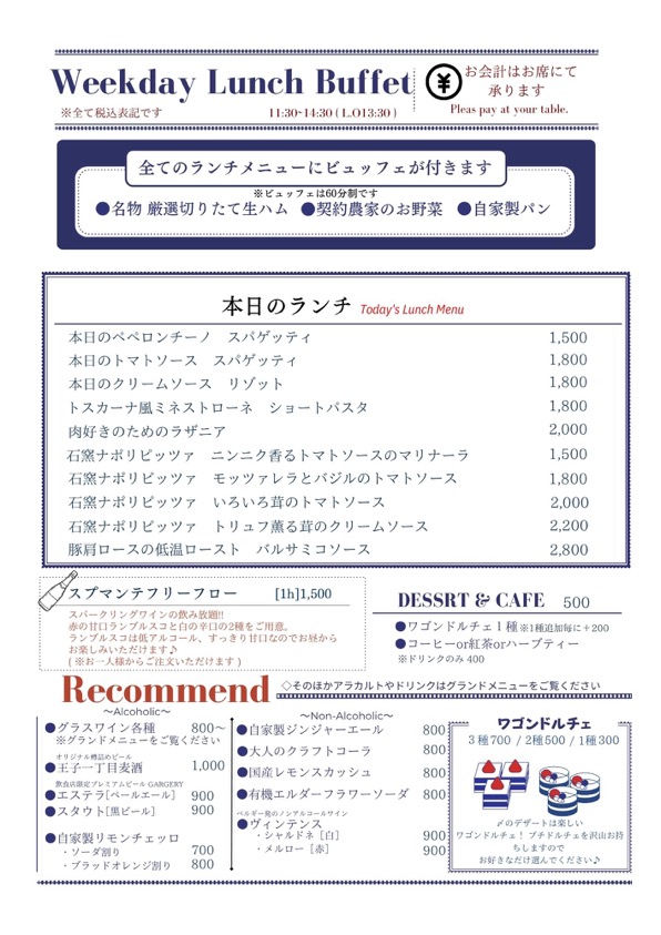 ランチ:11:30~14:30 (料理L.O. 13:30 ドリンクL.O. 13:30)