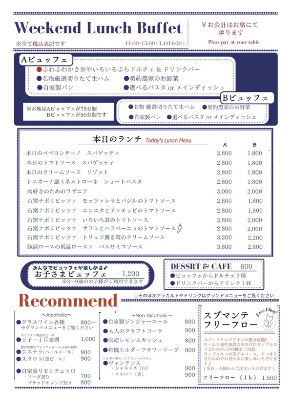 ランチ:11:00~15:00 (料理L.O. 14:00 ドリンクL.O. 14:00)